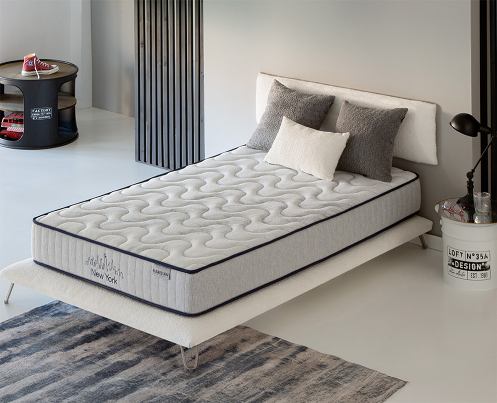 El colchón New York de la Serie Juvenil es un modelo pensado para ofrecer un descanso cómodo y saludable a los más jóvenes. Incorpora Viscoelástica de 50 kg, que aporta adaptabilidad y confort, junto con un núcleo de HR Soft de 26 kg en 8 cm y HR de 25 kg en 10 cm, garantizando firmeza, resistencia y transpirabilidad. Gracias a esta estructura equilibrada, el modelo New York proporciona el soporte adecuado para un descanso reparador cada noche, convirtiéndose en una opción ideal para quienes buscan calidad, frescura y bienestar en su sueño diario.